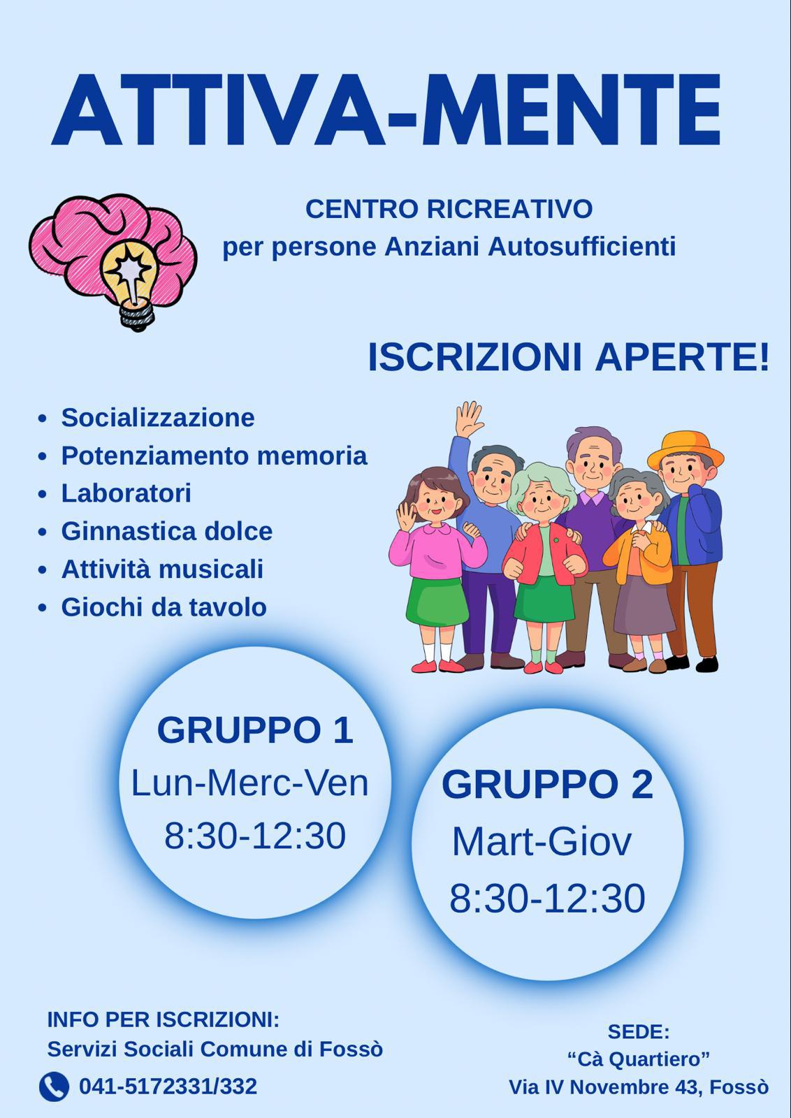 ATTIVA-MENTE è un Centro Ricreativo dove Anziani Autosufficienti svolgono attività di Socializzazione, Potenziamento memoria, Laboratori, Attività Musicali, Ginnastica dolce, Giochi da tavolo.